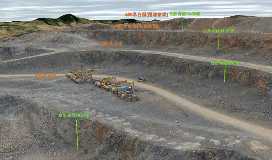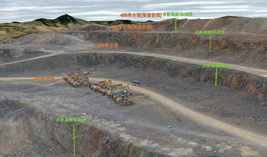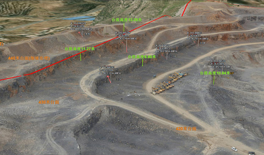 3、核查矿山是否按照开发利用指标进行开采(开采台段、最终边坡、终了台段、安全平台、爆破边界、台阶高度等)。